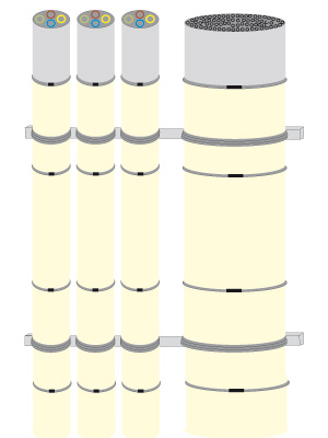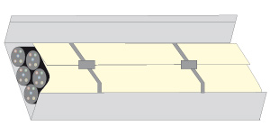 Horizontal, vertikal und schräg verlegte Elektroleitungen, Kabeltrassen, Einzelkabel oder Kabelbelegungen mit PVC- oder PE-Kabeln. Kabelgröße bzw. deren Gesamtleiterquerschnitt und die Größe der Kabelkonstruktion sind unbegrenzt.